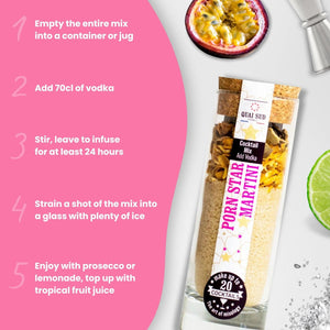 This Porn Star Martini Cocktail Mix makes it effortless to shake up the iconic bar favourite at home. A tropical blend of passion fruit, lime, and smooth vanilla, this pre-made mix delivers all the punchy, fruity flavour of a professional cocktail – just add vodka and a dash of sparkle.