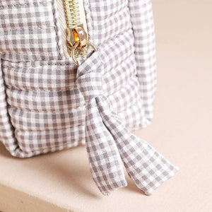This Small Grey Gingham Linen Travel Bag brings timeless charm to your everyday organisation. Made from soft linen with a subtle grey and cream check, it’s compact yet roomy enough to hold your beauty essentials, accessories, or toiletries. Finished with a gold zip and gingham tie, it’s a chic little companion for your handbag, suitcase, or dressing table.